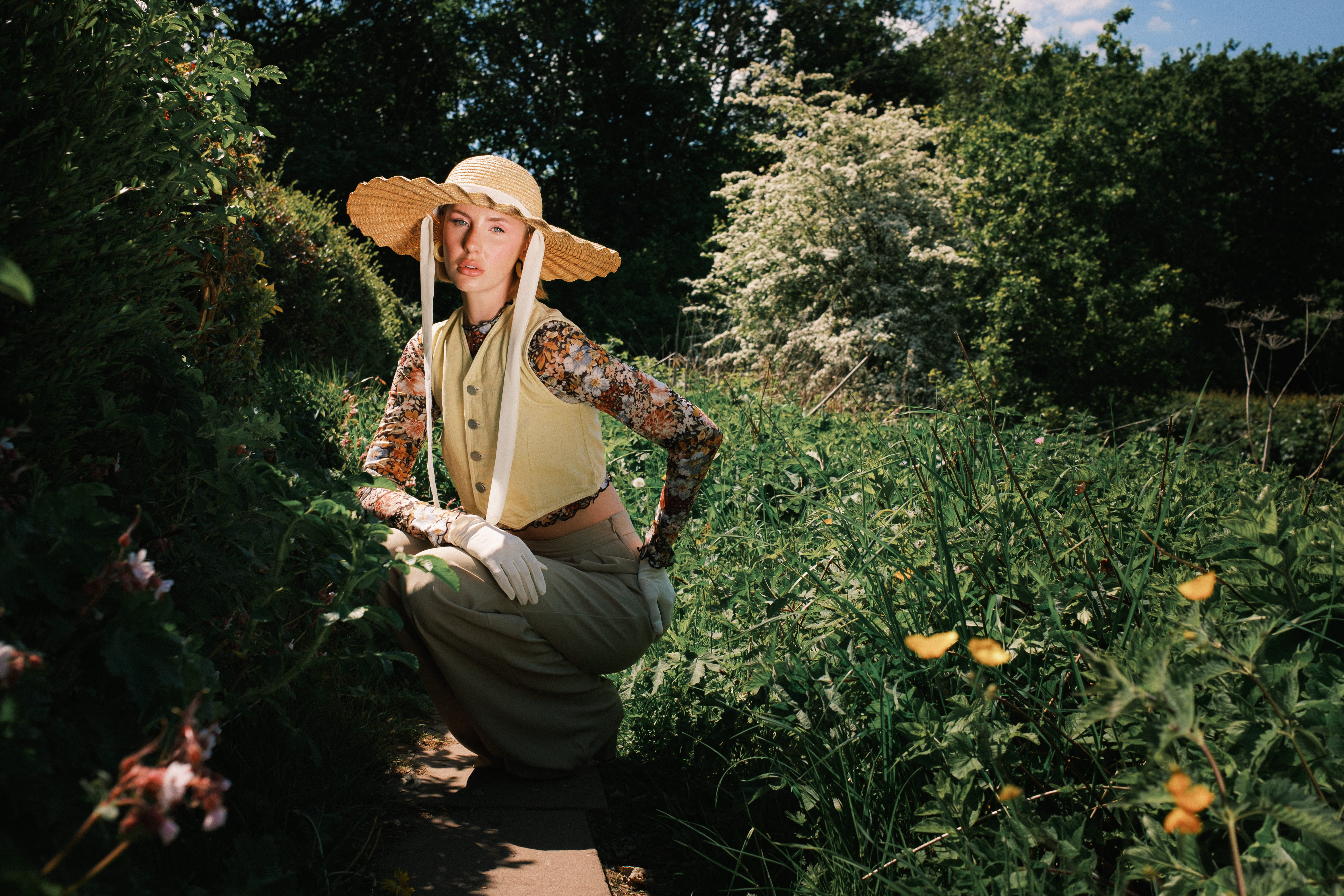 Miya wears Green Trousers, Yellow Waist, Floral Mesh Top, White Gloves, Mary Jane Shoes, Straw Hat with White Ribbons and Jewellery STYLIST’S ARCHIVE